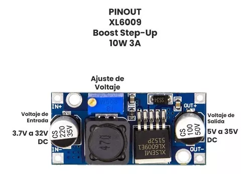 Fuente basada en regulador step-up DC-DC XL6009 con salida regulable de 5V a 35V. Con preset multivuelta de alta precisión es capaz de alimentar cargas de hasta 3A.