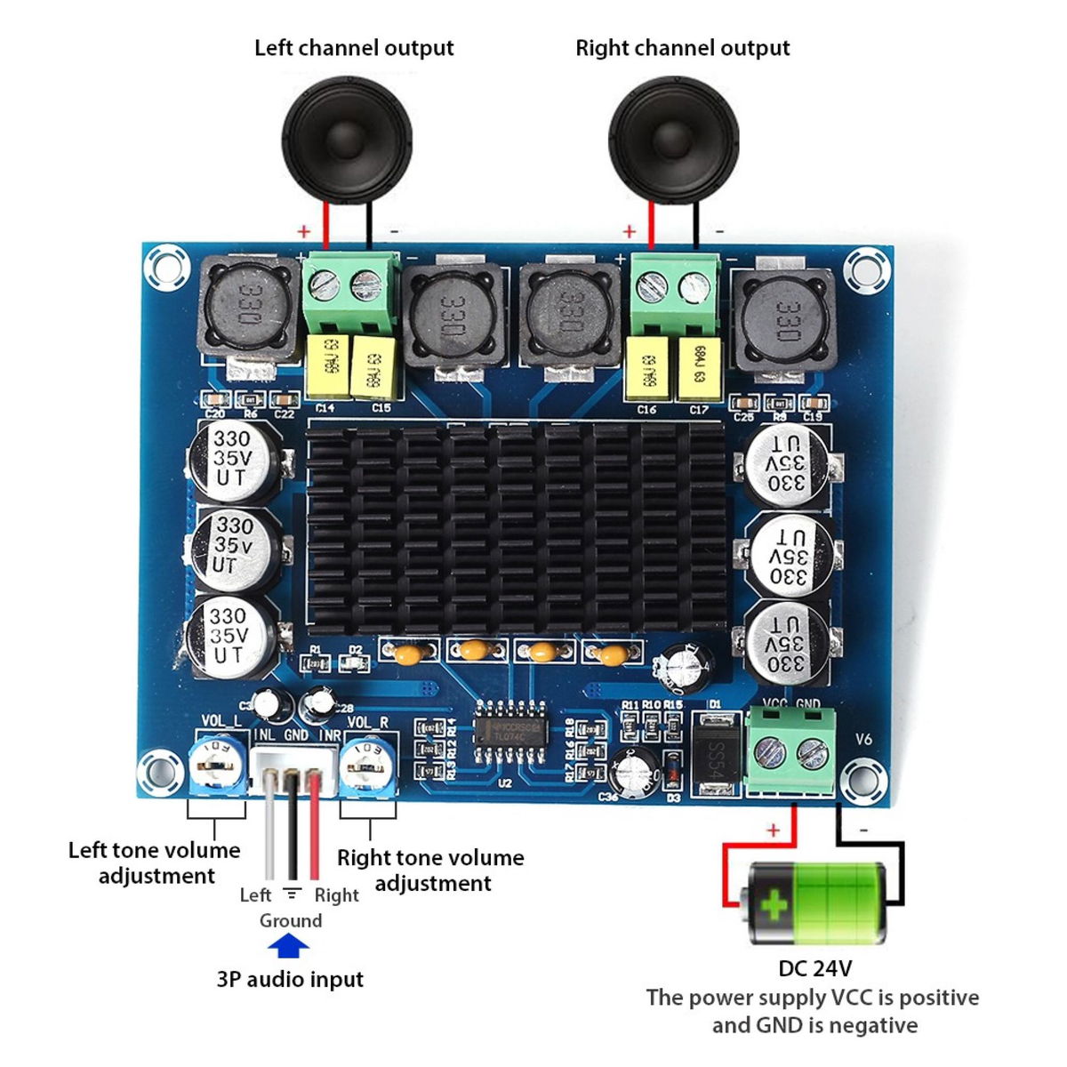 Potencia de salida 120+120 W rms (24V) a 4 ohm (requiere cooler)